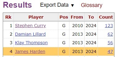 據統計,這是哈登職業生涯第48次半場至少命中5記三分,NBA歷史排名第4,僅次于庫里(123次)、利拉德(62次)和克萊(56次)。