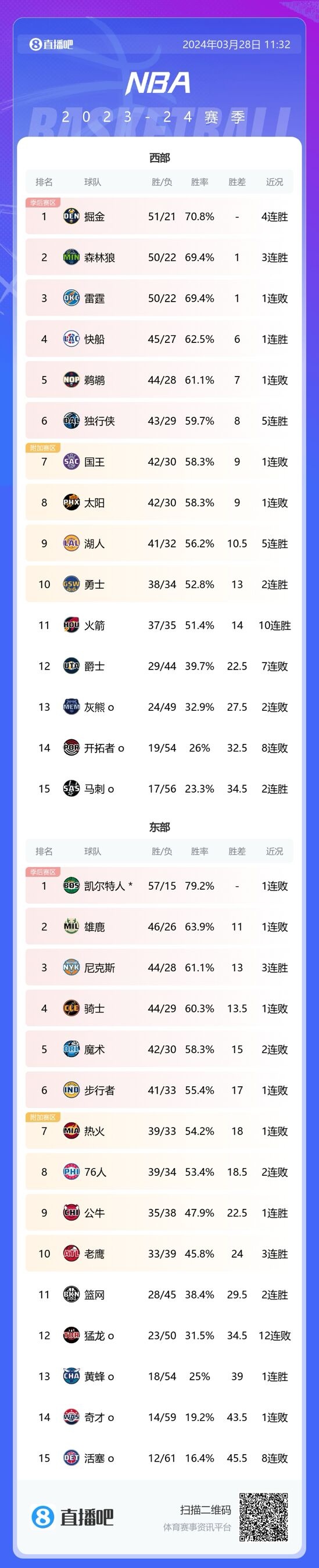 3月28日訊 NBA常規(guī)賽,森林狼106-91戰(zhàn)勝活塞,而雷霆在主場以126-132加時不敵火箭。