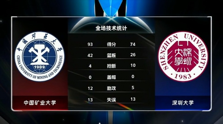 末節爭奪,中國礦大牢牢占據場上主動,多次利用長傳反擊輕松拿分擴大優勢,依然是陳思宇里突外投拿分苦苦支撐,李如鋒飆中打板三分,林澤佳三分也有給出回應,過大的分差讓比賽早早失去懸念,王志楠也犯滿離場。最終,中國礦大93-74擊敗深圳大學。