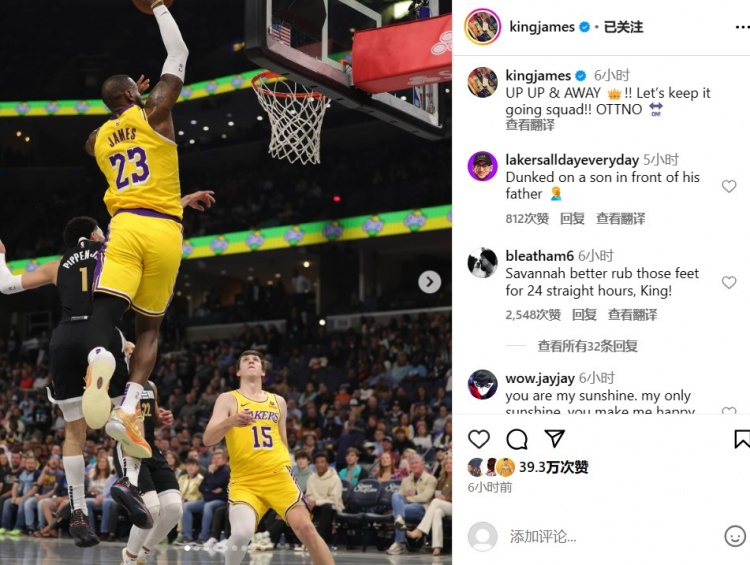 賽后,詹姆斯在INS曬出了自己空接隔扣的照片,并寫道:“起飛&起飛了