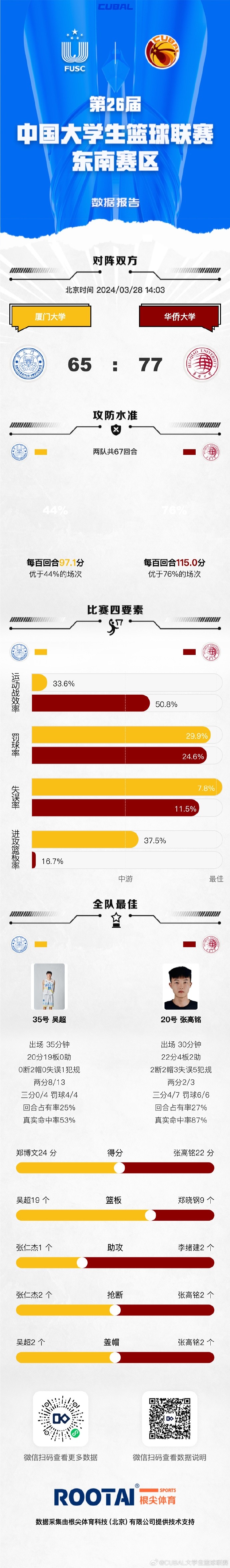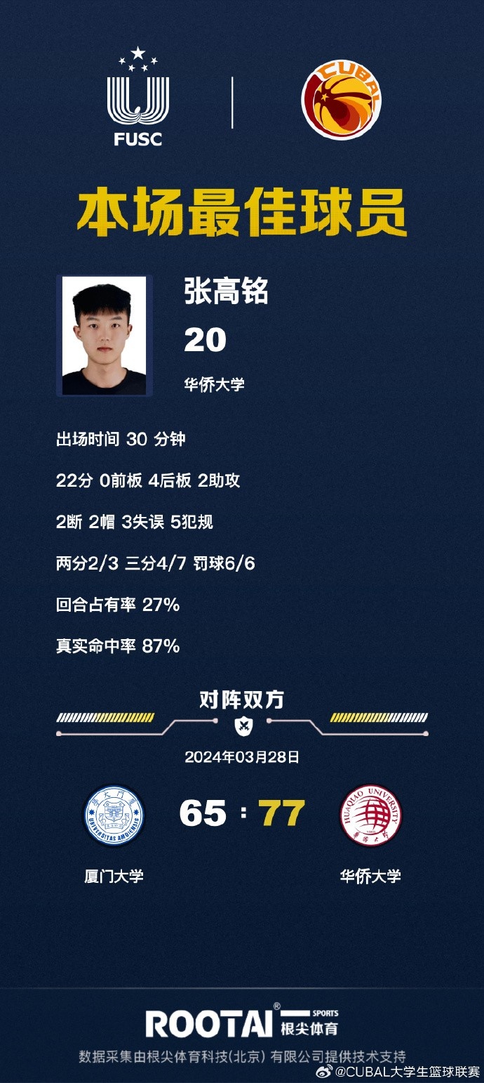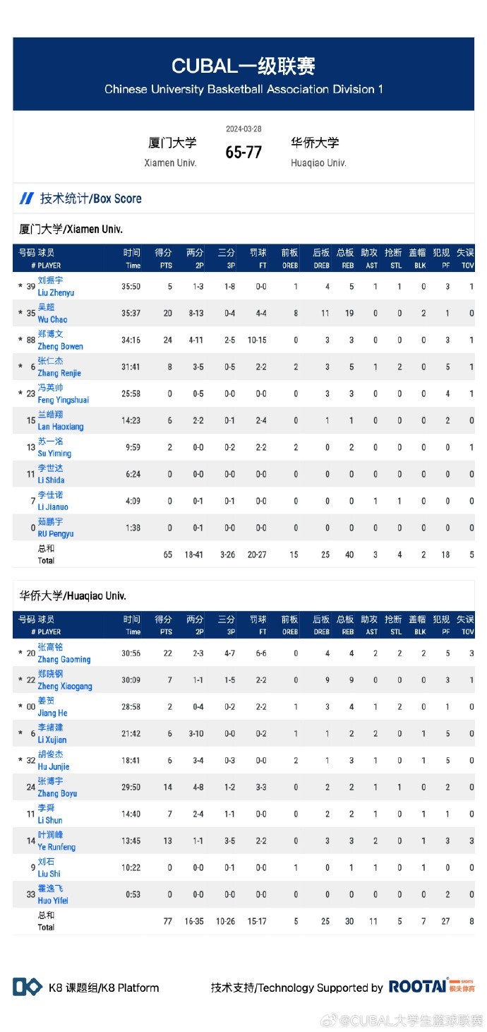 華僑大學:張高銘22分4籃板2助攻2搶斷、張博宇14分2籃板、鄭曉鋼7分9籃板、李緒建6分2籃板2助攻、胡俊杰6分3籃板、葉潤峰13分3籃板2助攻、李舜7分2籃板。