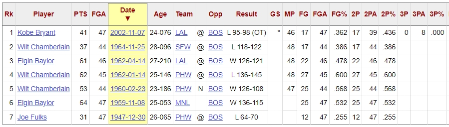 根據數據統計,上一個對陣綠軍出手至少44次的球員,是2002年11月7日(當地時間)的科比,那場比賽他47投17中,砍下41分,湖人95-98不敵凱爾特人。
