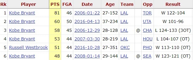 據統計,過去20年,單場出手至少44次球員有三人:科比、威少、和今天的穆雷。