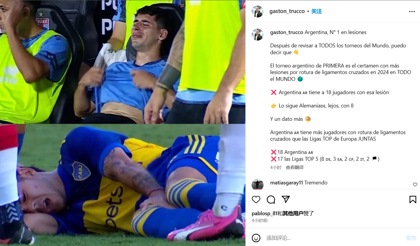 4月2日訊 據(jù)記者Gaston Trucco統(tǒng)計(jì),2024年以來阿根廷超級聯(lián)賽一共有18名球員遭遇十字韌帶斷裂重傷,高居世界第一,而且這一數(shù)字已經(jīng)超過了歐洲五大聯(lián)賽總和。