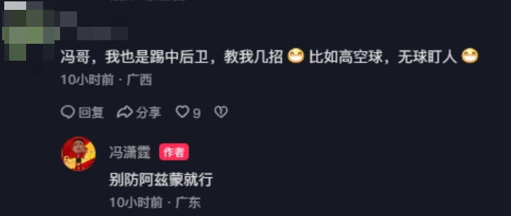 有網(wǎng)友給馮瀟霆留言:馮哥,我也是踢中后衛(wèi),教我?guī)渍校热绺呖涨颍瑹o球盯人。