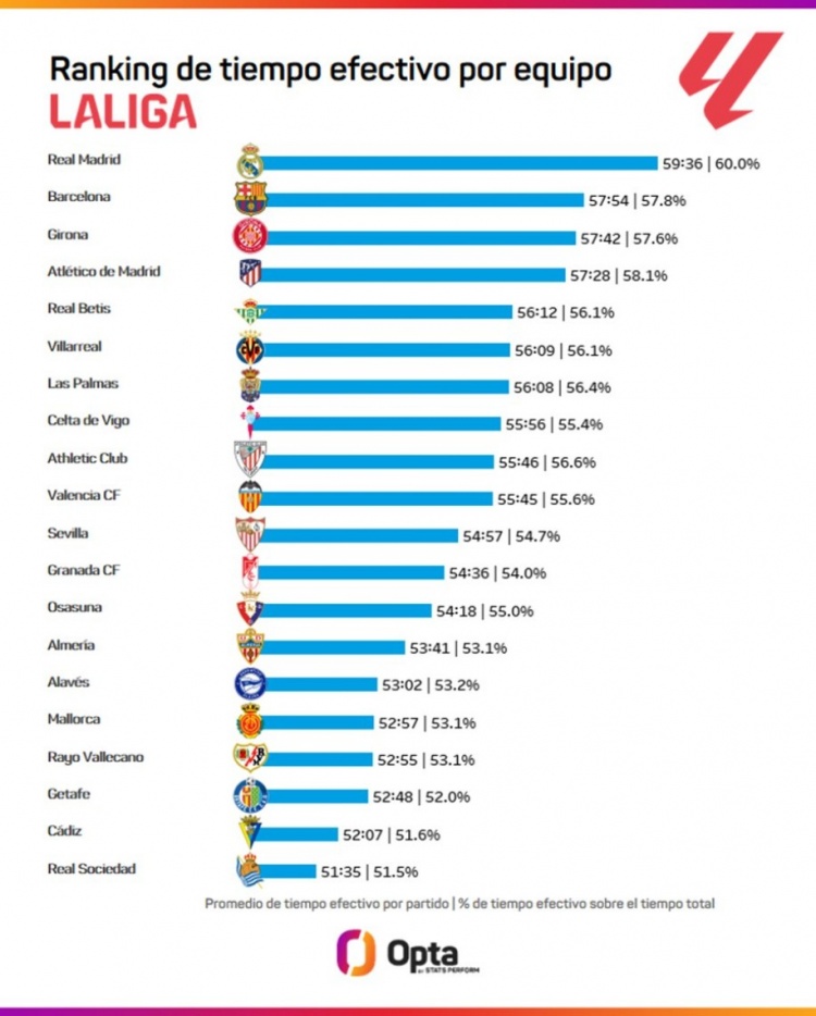 巴薩、赫羅納和馬競分列第二到第四位,平均有效比賽時(shí)長分別為57分54秒、57分42秒和57分28秒,他們在聯(lián)賽的排名恰好也是第二到第四位。