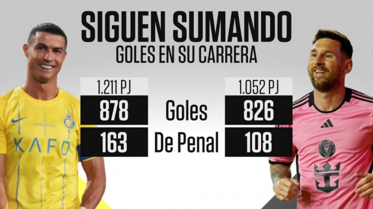 ESPN統計了梅西和C羅職業生涯至今的進球數據,并作出對比,C羅出戰1211場比賽,打進878粒進球,其中包括163粒點球;梅西出戰1052場比賽,攻入826球,其中包括108粒點球。