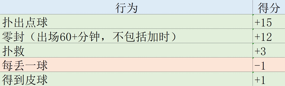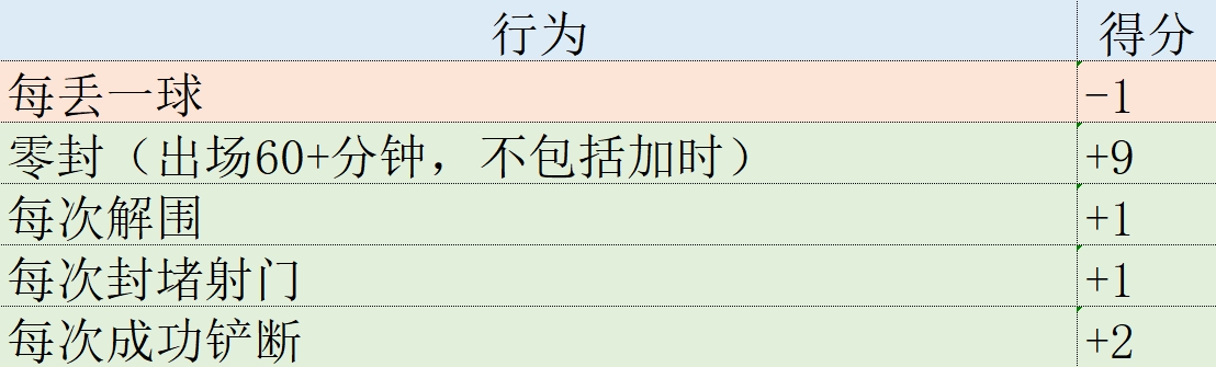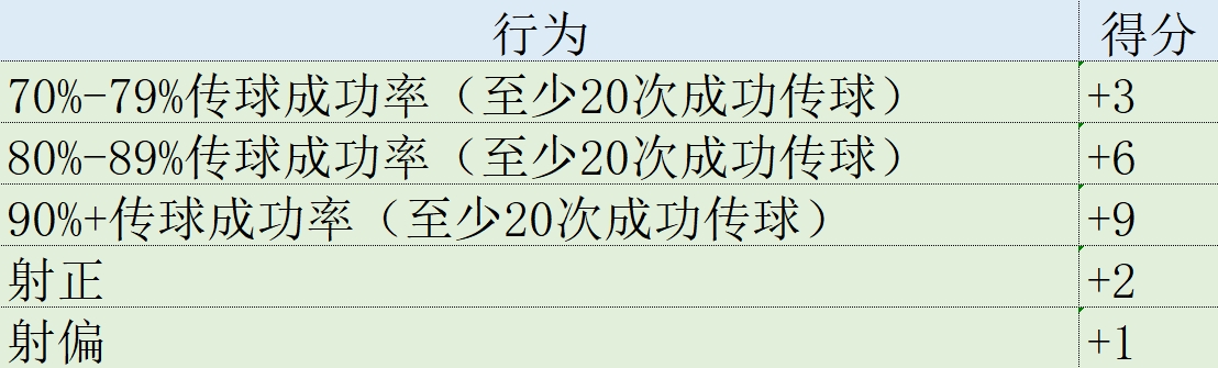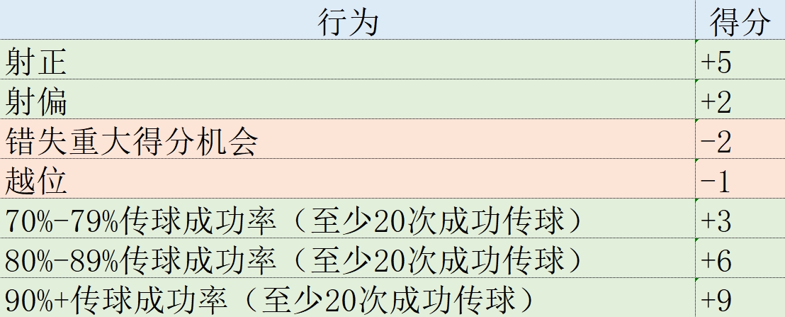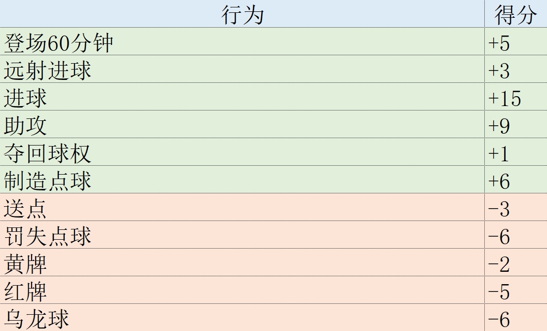 某些場上行為所產生的積分,例如進球、助攻和奪回球權,對所有位置的球員都是相同的。其他數據則取決于每個球員的具體位置。例如,零封、成功鏟斷和封堵是防守球員的關鍵數據,而射門和成功傳球是中場和前鋒的重要指標。