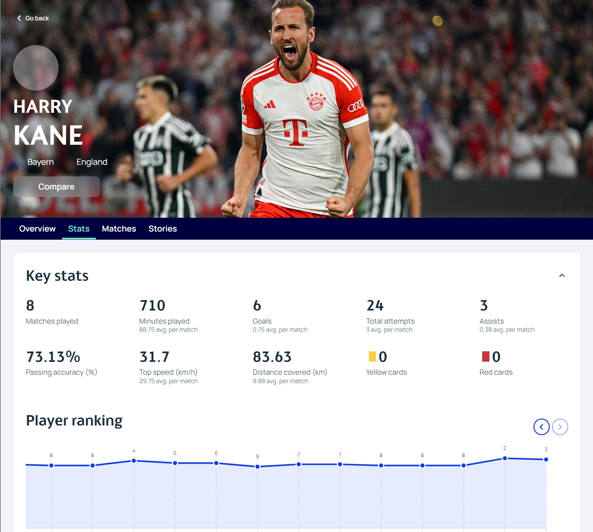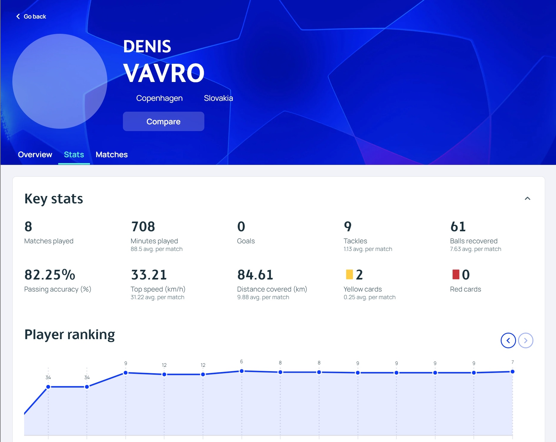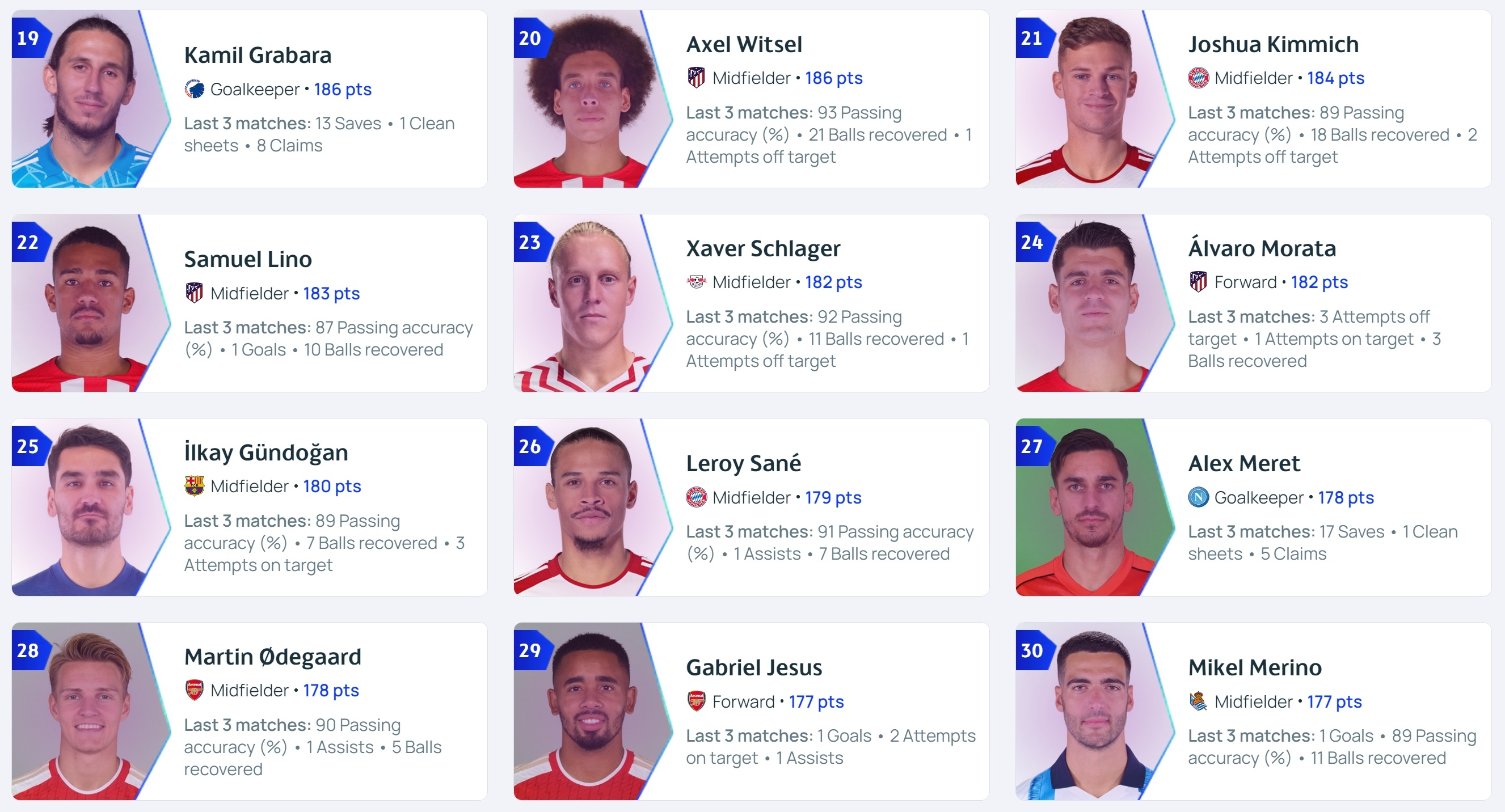 歐冠官方從21/22賽季開始推出一項全新評分:球員表現分。該項評分將會把球員比賽時的各項數據輸入到設計的算法中,根據表現來累計積分進行排名,并在每個比賽日更新,作為球員單賽季歐冠整體表現的衡量標準之一。