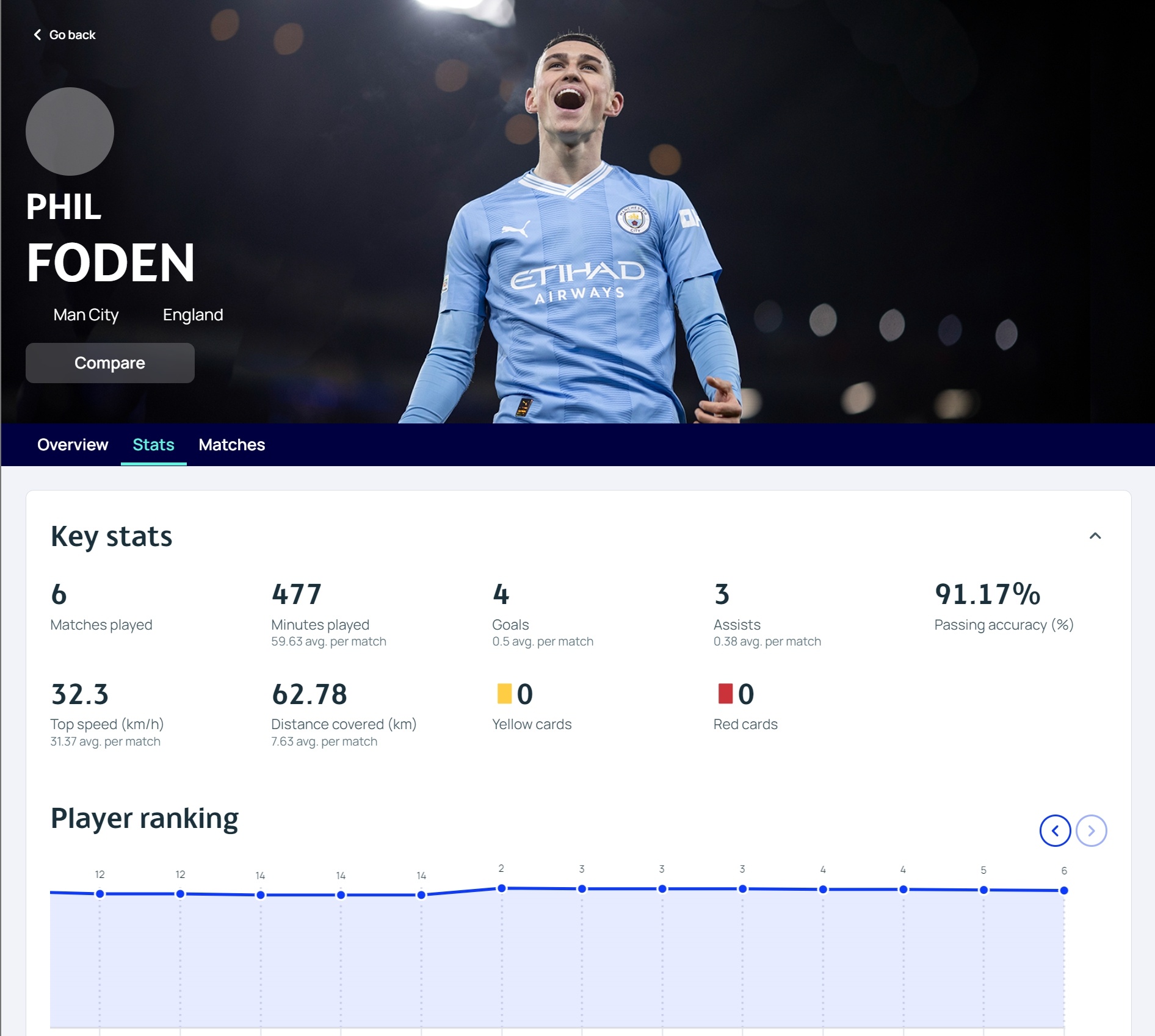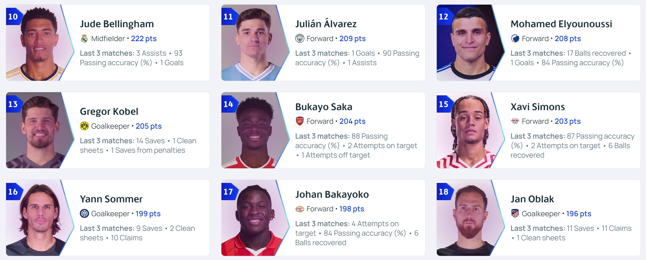 歐足聯將跟蹤球員在整屆賽事中的表現。來自歐洲冠軍聯賽的比賽數據將被輸入到一個專門設計的算法中,根據表現進行排名,并在每個比賽日更新。