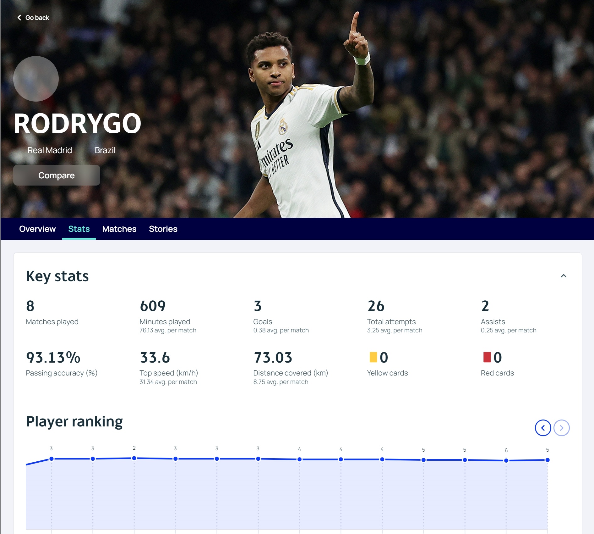 出場時間:708分鐘(場均88.5)、傳球成功率:82.25%、最高速度33.21km/h、跑動距離:84.61km(場均9.88km)