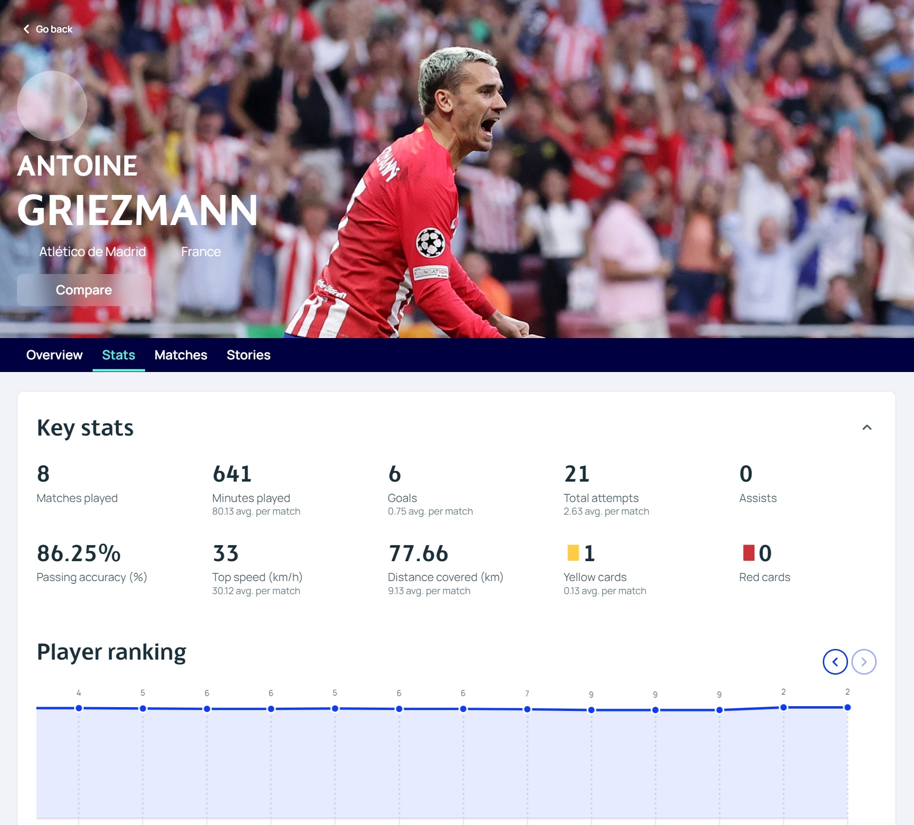 球員表現方面,格列茲曼是一位真正的戰士!傷愈復出首場比賽便出戰105分鐘,賽后他表示傷處仍然很疼。本場比賽在迪馬爾科進球后,格列茲曼迅速予以回應!憑借在歐冠中一如既往的優秀表現,格列茲曼的歐冠表現分在本周超越哈蘭德排名第二!僅次于姆巴佩。
