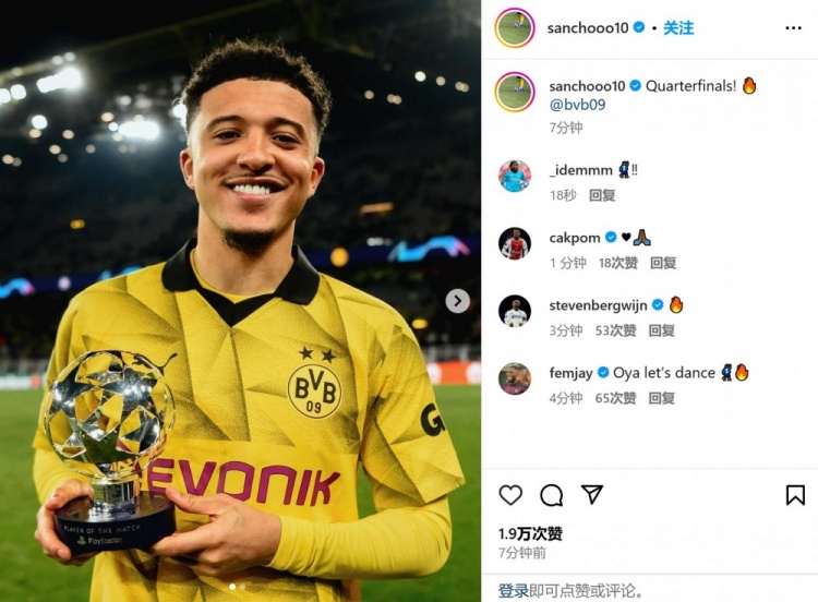 3月14日訊 歐冠1/8決賽,多特主場2-0擊敗埃因霍溫,總比分3-1順利晉級8強。本場比賽,桑喬打進一球,當選全場最佳球員。賽后,桑喬也更新了社交媒體,慶祝球隊晉級。