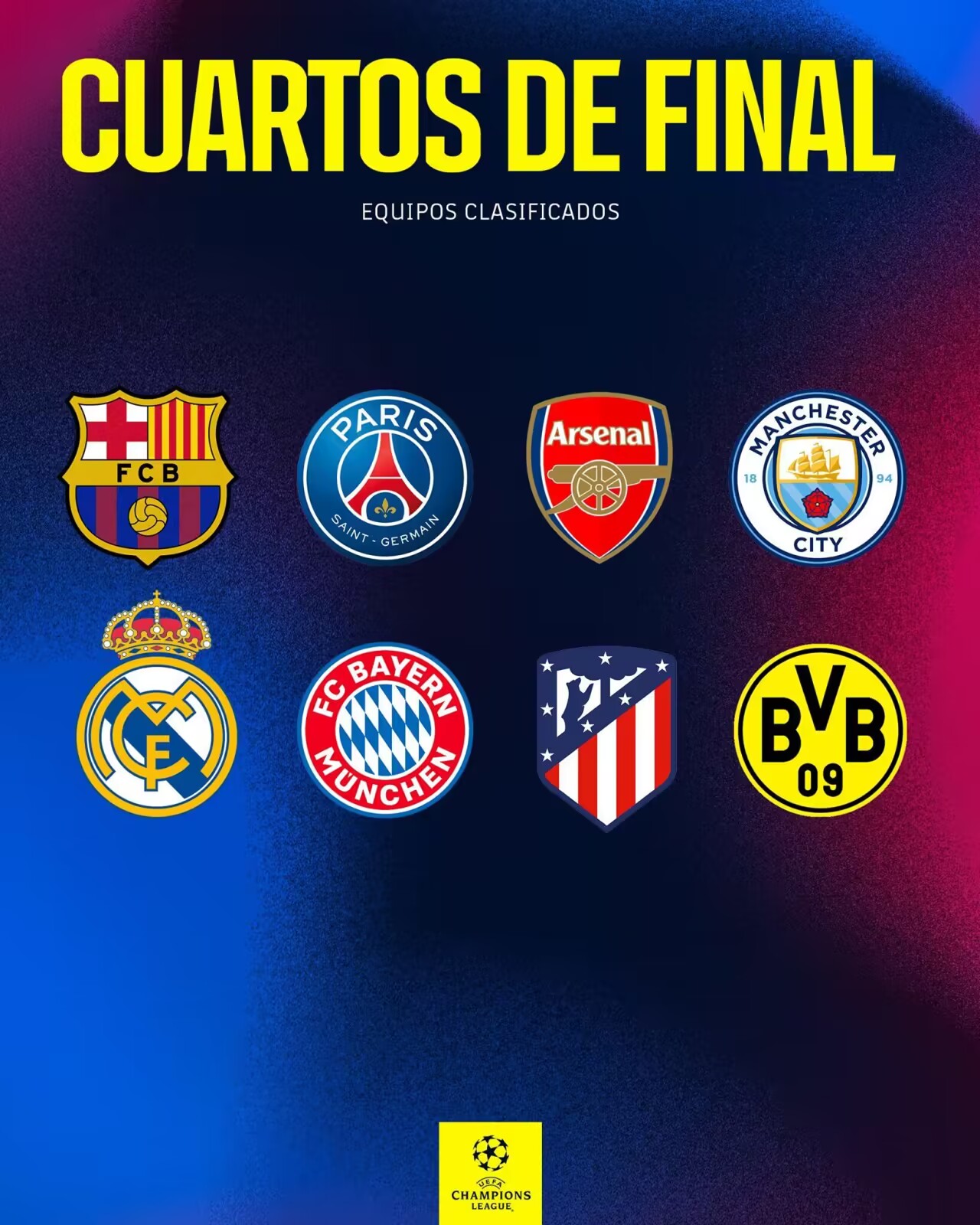 歐冠1/4決賽全部結束,本賽季歐冠8強全部出爐:皇馬、巴薩、拜仁、曼城、巴黎、阿森納、馬競、多特。