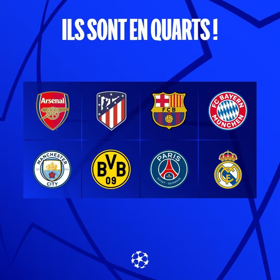 歐冠1/4決賽全部結(jié)束,本賽季歐冠8強(qiáng)全部出爐:皇馬、巴薩、拜仁、曼城、巴黎、阿森納、馬競(jìng)、多特。