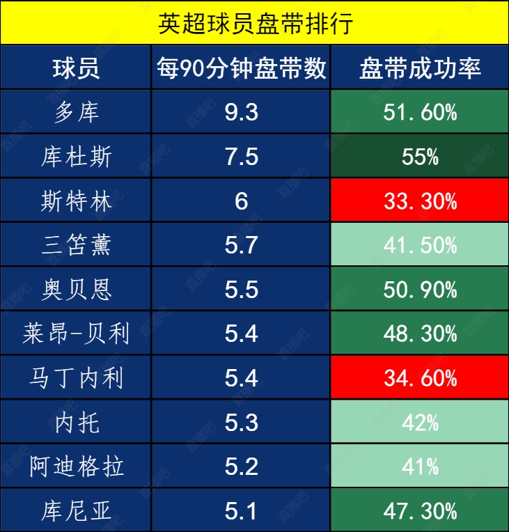英超盤帶排行:多庫庫杜斯領跑,三笘薰在列,斯特林近7年最低效
