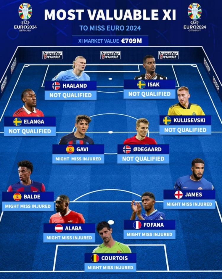 3月21日訊 歐洲杯即將在今夏拉開(kāi)帷幕,德轉(zhuǎn)盤(pán)點(diǎn)了目前預(yù)計(jì)無(wú)法出戰(zhàn)歐洲杯球員的最貴陣容,其中哈蘭德、厄德高等人已經(jīng)由于國(guó)家隊(duì)被淘汰而確定無(wú)緣,加維等人則由于重傷可能無(wú)法趕上歐洲杯。以下為具體陣容: