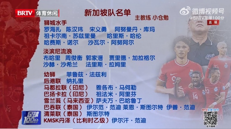 在介紹新加坡隊時,《足球100分》主持人說道:“小倉勉是新加坡隊新上任的主教練,這支球隊大部分是本土球員,也有像宋義勇這樣的歸化球員。新加坡隊有大批球員來自獅城水手,當然也有在印尼、馬來西亞和泰國聯賽踢球的球員。”