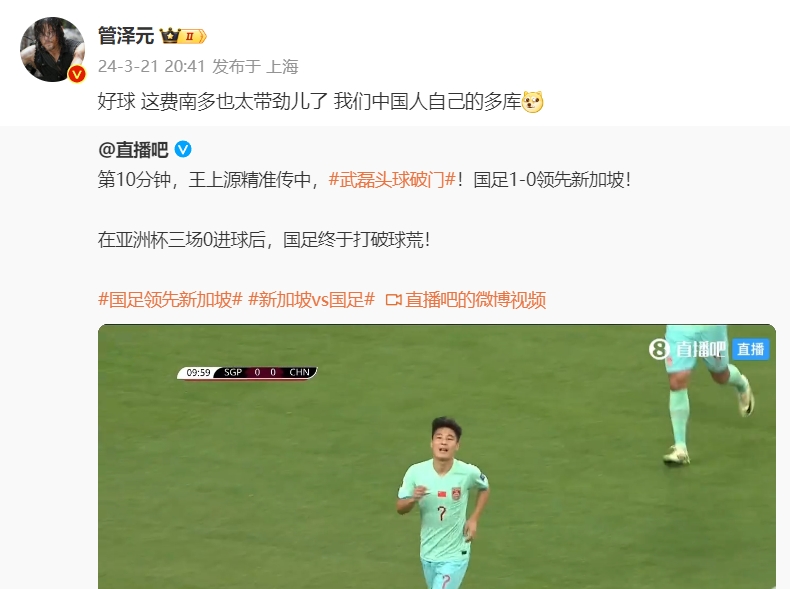 03月21日訊 世預(yù)賽中國(guó)男足客戰(zhàn)新加坡男足,目前國(guó)足1-0領(lǐng)先,知名三棲解說(shuō)管澤元轉(zhuǎn)發(fā)動(dòng)態(tài),夸贊國(guó)足攻擊手費(fèi)南多。