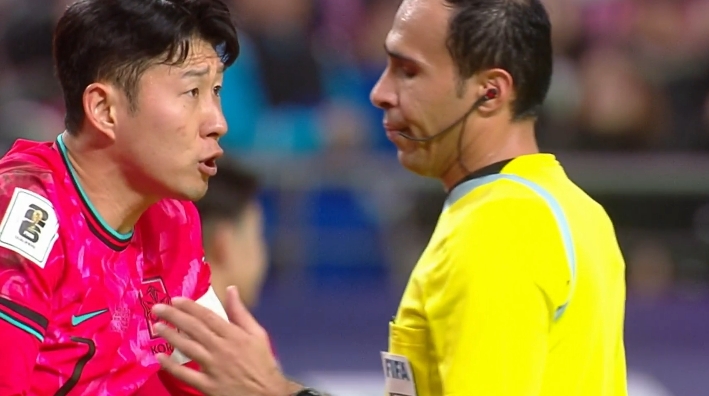 孫興慜禁區內倒地,裁判吹他進攻犯規,孫很不滿