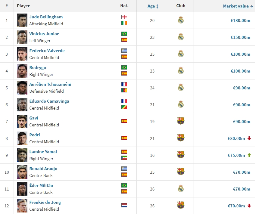 1、貝林厄姆:1.8億(不變)