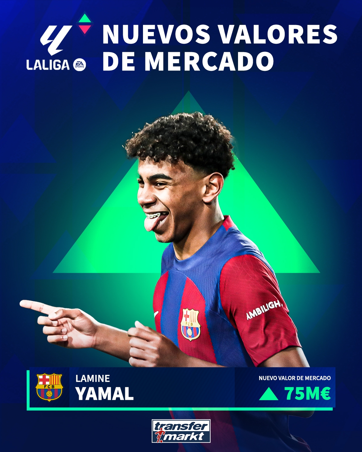 03月21日訊 德轉今日更新西甲的身價,巴薩16歲的西班牙國腳亞馬爾身價暴漲1500萬歐,現在已經高達7500萬歐。