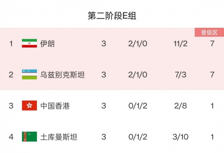 E組:伊朗5-0土庫(kù)曼斯坦、中國(guó)香港0-2烏茲別克斯坦