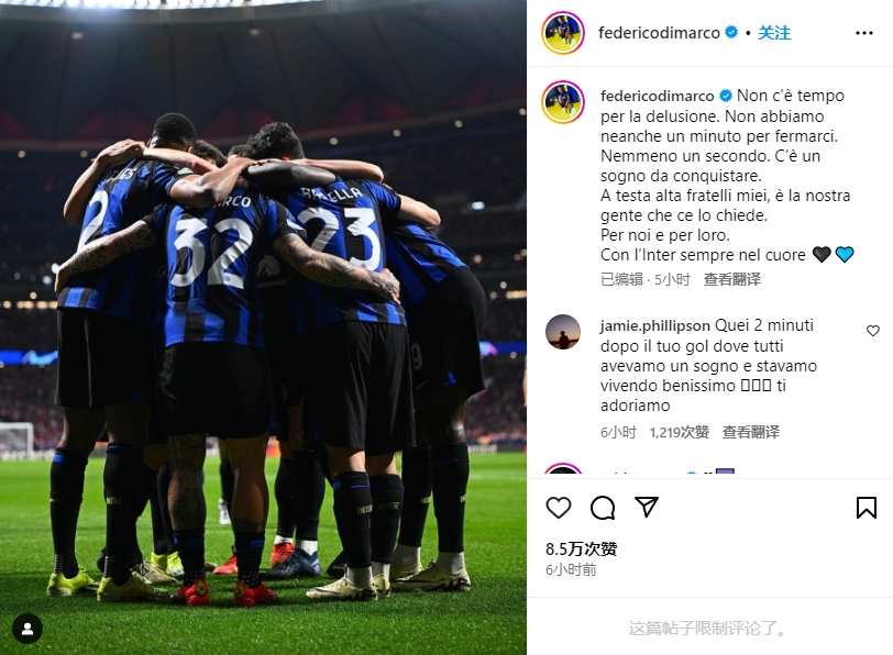 3月15日訊 在國米被馬競從歐冠八分之一決賽淘汰出局后,國米邊后衛迪馬爾科更新了社交媒體鼓勵球隊。