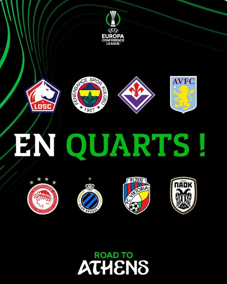 歐會8強:里爾、費內巴切、佛羅倫薩、阿斯頓維拉、奧林匹亞科斯、布魯日、比爾森勝利、塞薩洛尼基