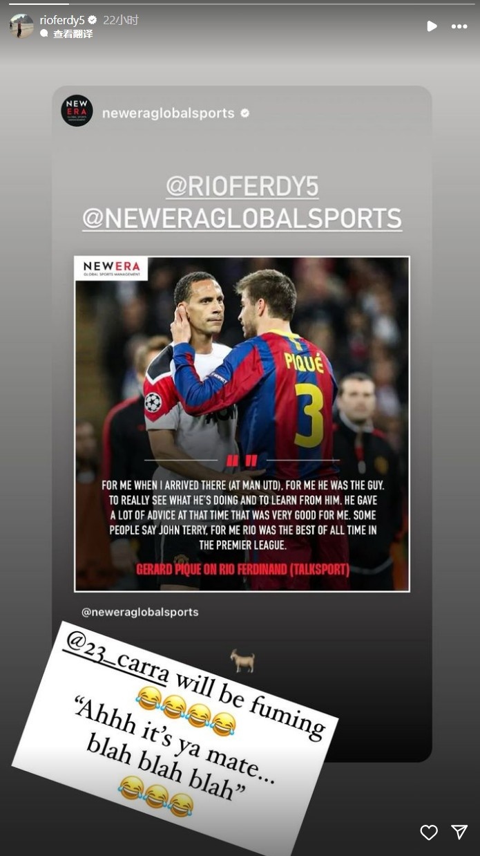 費迪南德轉(zhuǎn)發(fā)了這條新聞后@了卡拉格,表示:“這家伙得氣死,他肯定會說皮克是你的隊友諸如此類的。”