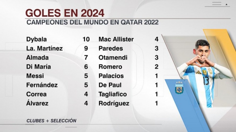 ESPN統計了阿根廷國腳(指2022年世界杯冠軍成員)2024年在各賽事中的進球數量,并列出榜單,迪巴拉以10球居首,勞塔羅9球次席,阿爾馬達以7球排名第三位。