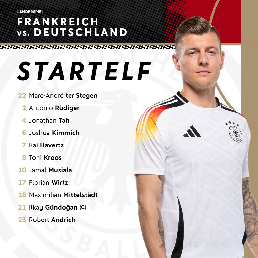 德國首發:22-特爾施特根、2-呂迪格、4-若納坦-塔、6-基米希、7-哈弗茨、8-克羅斯、10-穆西亞拉、17-維爾茨、18-米特爾施塔特、21-京多安、23-安德里希