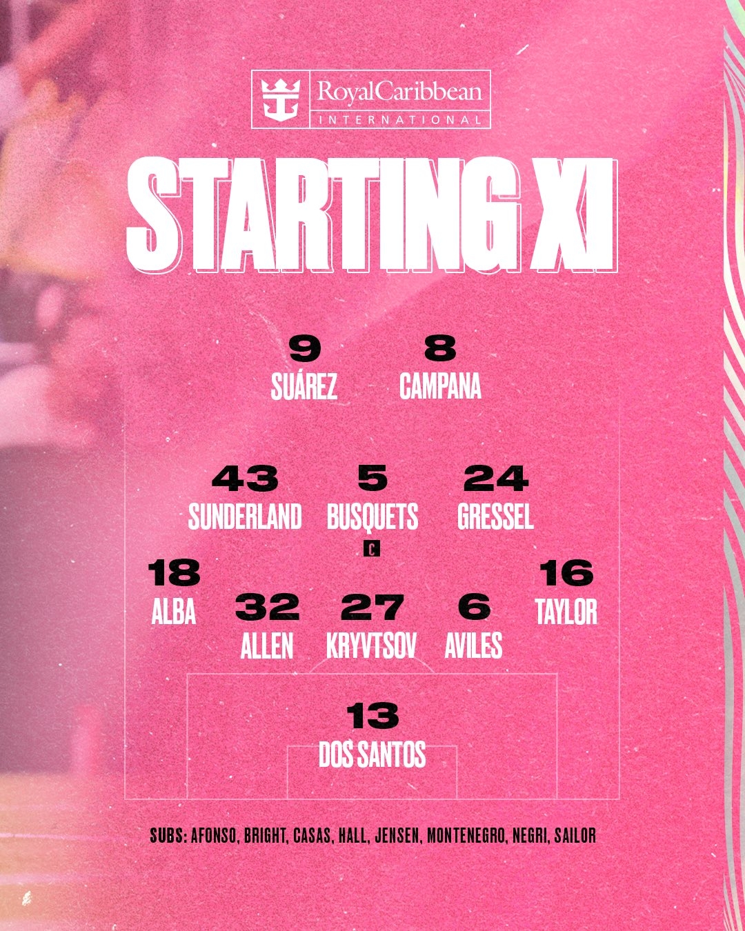邁阿密國際首發(fā):13-多斯桑托斯、6-阿維萊斯、32-阿倫、27-克里夫索夫、18-阿爾巴、16-泰勒、43-桑德蘭德、5-布斯克茨、24-格雷塞爾、8-坎帕納、9-蘇亞雷斯