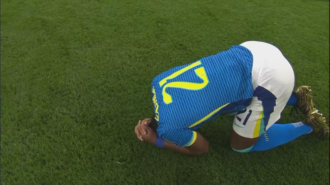 17歲小將恩德里克本場斬獲巴西隊處子球,幫助球隊拿下勝利。賽后,他難掩激動之情,長時間跪地抱頭。