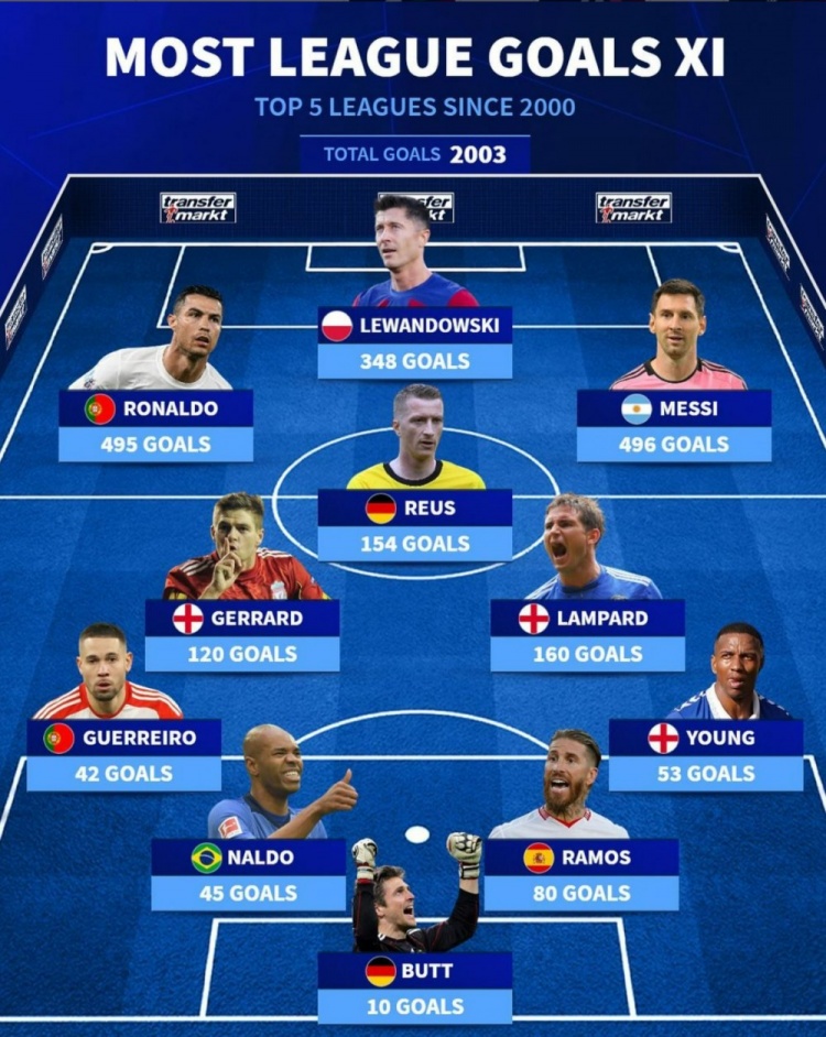 3月24日訊 德轉盤點了自2000年以來,在五大聯賽中進球最多的11人陣容,其中梅西、C羅、萊萬等在列,以下為具體陣容(只統計聯賽進球):