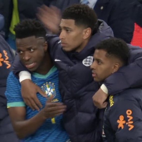 我的巴西小兄弟貝林厄姆賽后左手摟羅德里戈,右手摟維尼修斯