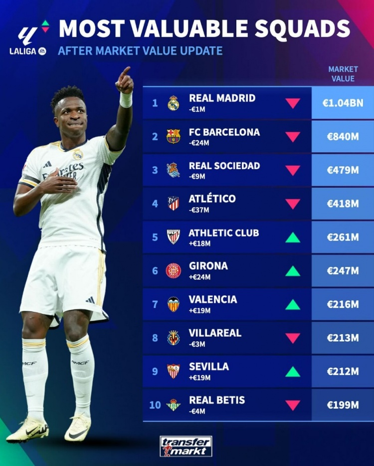 3月24日訊 德轉更新了西甲球員身價,并盤點了目前西甲球隊身價榜,其中皇馬以10.4億歐高居榜首,巴薩次席,以下為具體榜單: