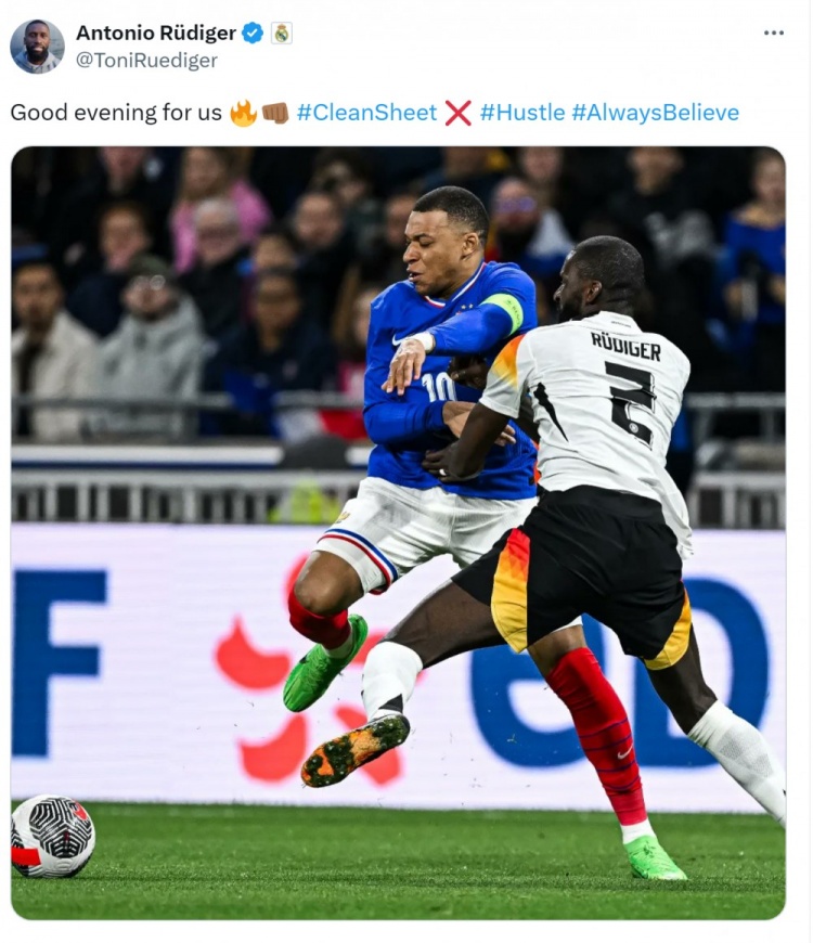 呂迪格在社交媒體上曬出防守姆巴佩的照片,并寫道:“對我們來說是很好的夜晚