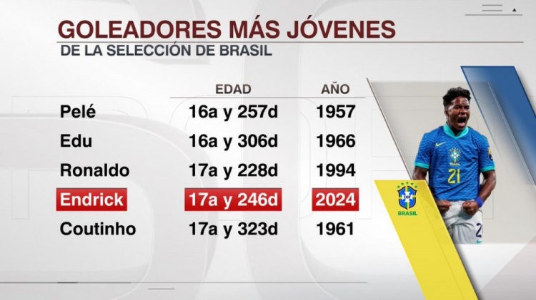 ESPN統計了球員在巴西隊打進首球的年齡,并列出最年輕球員榜單,貝利居首,現年17歲246天的恩德里克排名第4位,而他將在今夏正式加盟皇馬。