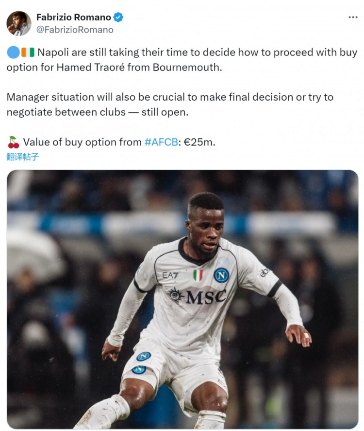 特拉奧雷今年1月從伯恩茅斯租借加盟那不勒斯,租借期限為半個賽季。羅馬諾指出,那不勒斯仍在花時間決定是否買斷這位24歲的科特迪瓦中場。
