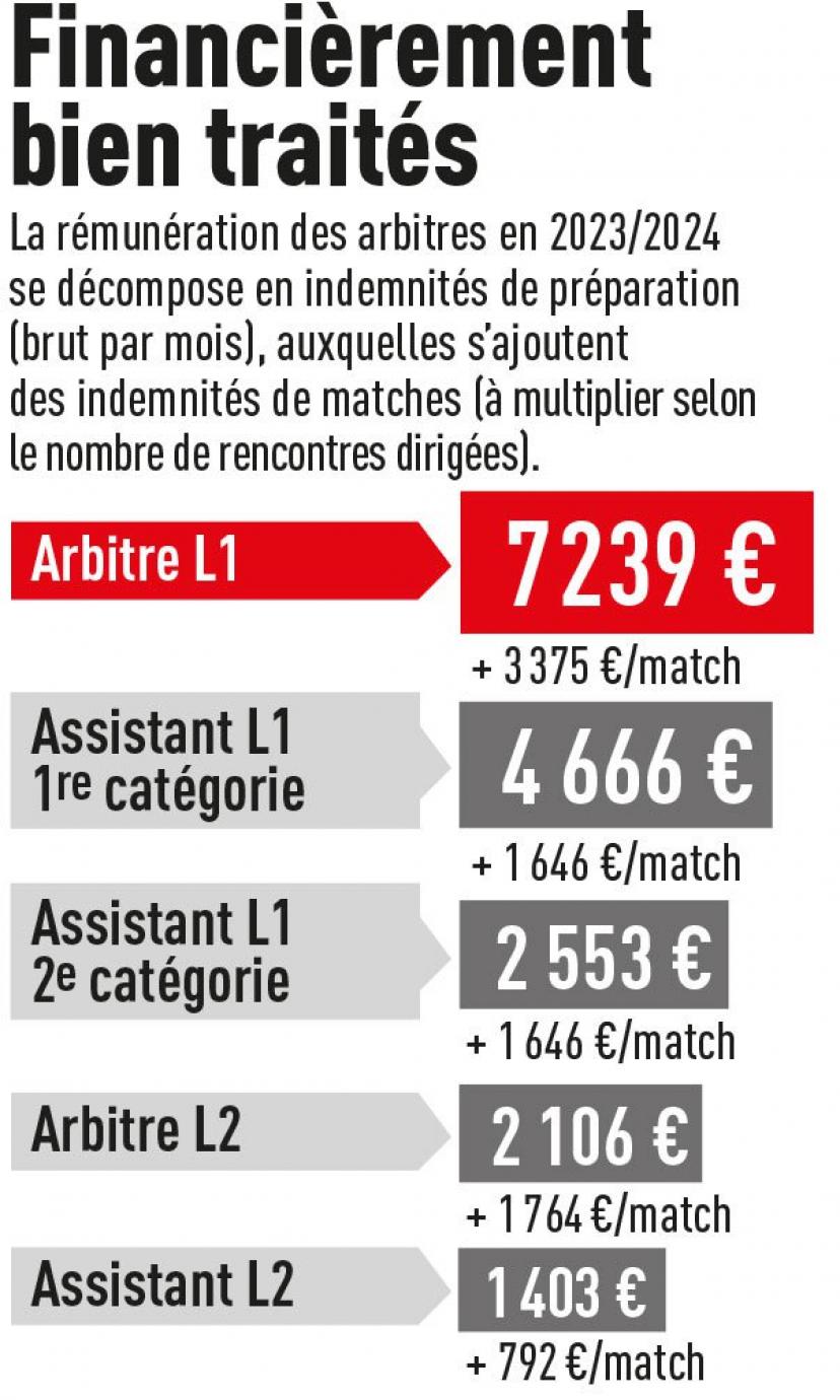 本賽季法甲裁判的基本月薪是7239歐元,執(zhí)法法甲比賽的每場補(bǔ)貼是3375歐元,還能獲得600歐元的交通、住宿和用餐補(bǔ)貼。平均來說,一名法甲裁判每年的收入約為16.5萬歐元。