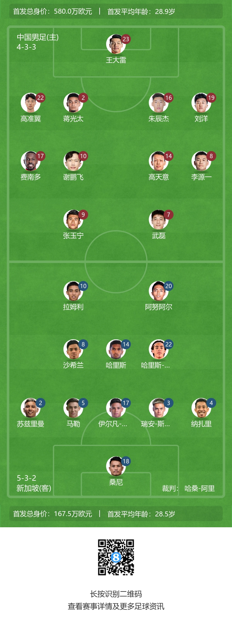 03月26日訊 今天20:00,男足世預賽亞洲區(qū)第二階段C組第4輪,中國隊坐鎮(zhèn)天津奧體中心體育場主場迎戰(zhàn)新加坡隊。賽前雙方首發(fā)陣容出爐,王大雷出任國足首發(fā)門將,武磊擔任隊長,張琳芃替補。【上,看世預賽!全程直播國足36強賽】