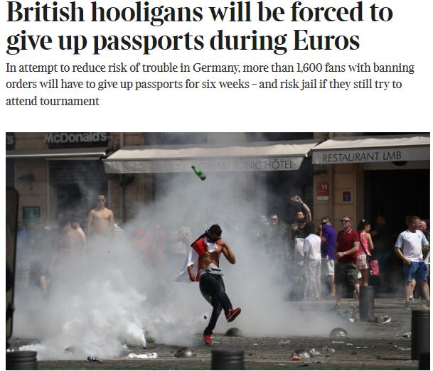 據悉,在今年夏天歐洲杯期間,這些英格蘭和威爾士的足球流氓將被迫向警方交出自己的護照,以防止他們在歐洲杯期間尋釁滋事。這些足球流氓需要在6月4日開始將自己的護照上交,直到7月14日歐洲杯結束,仍然試圖參與歐洲杯的人將有可能會面臨監禁。