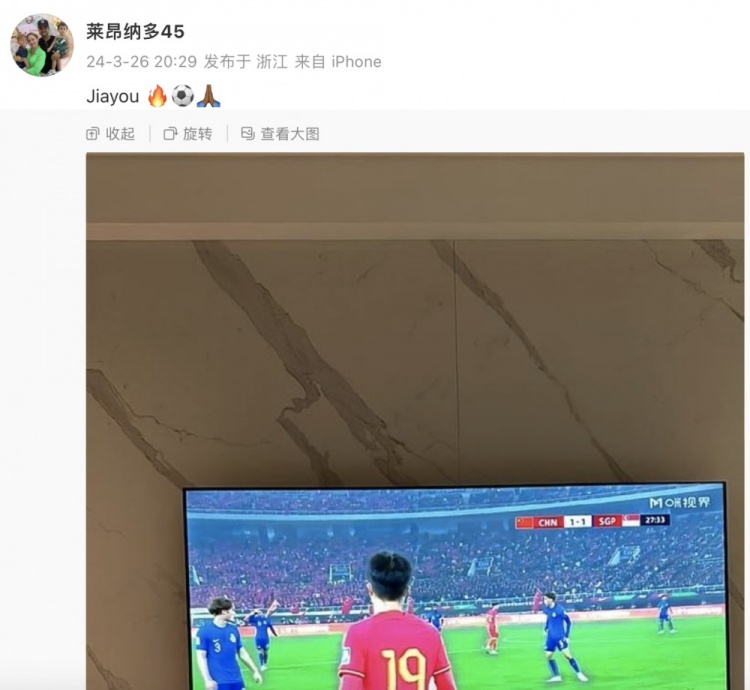 3月26日訊 今天,浙江隊外援萊昂納多也關注著國足主場與新加坡的比賽,并為國足加油助威。