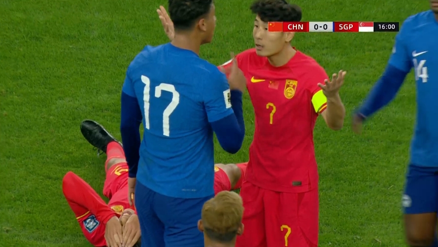 第17分鐘,張玉寧在爭頂時被撞倒,國足隊長武磊隨后與新加坡17號伊爾凡-凡迪貼臉對峙,隨后雙方球員上來息事寧人。