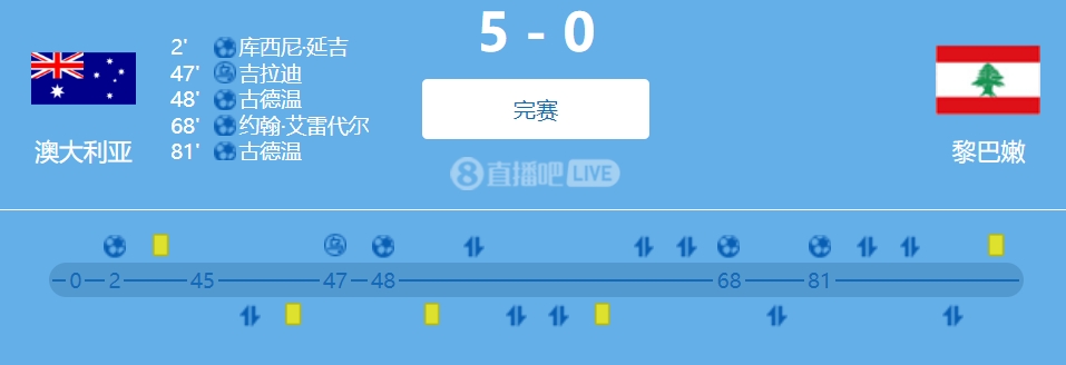 03月26日訊 世預賽亞洲區(qū)I組結束第四輪的一場較量,澳大利亞客場5-0大勝黎巴嫩,澳大利亞4戰(zhàn)全勝打入15球且1球未丟,提前2輪晉級,成為首支晉級18強賽的球隊。