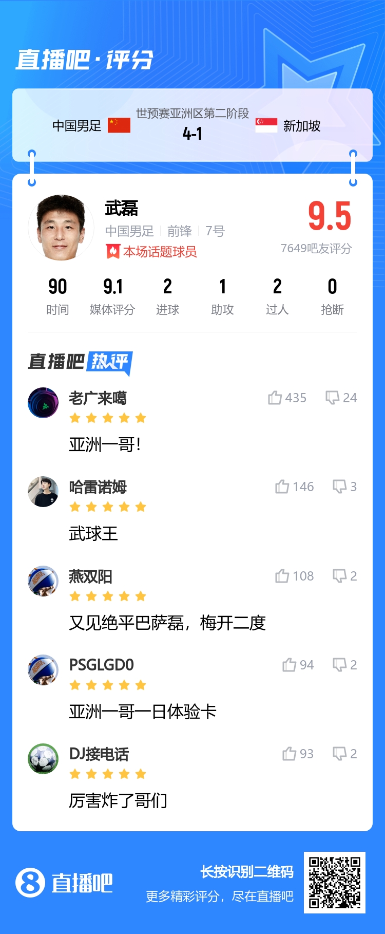 世預賽,國足主場4-1戰勝新加坡,本場比賽武磊兩射一傳,世預賽目前打入5球。吧友為他打出9.5分。