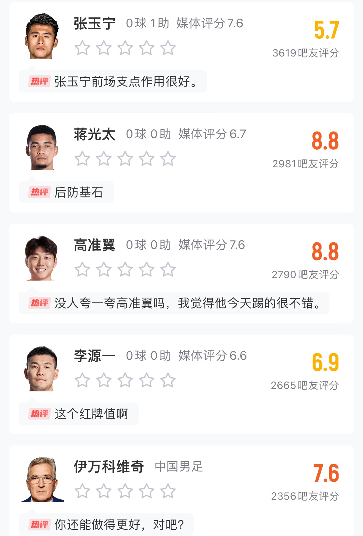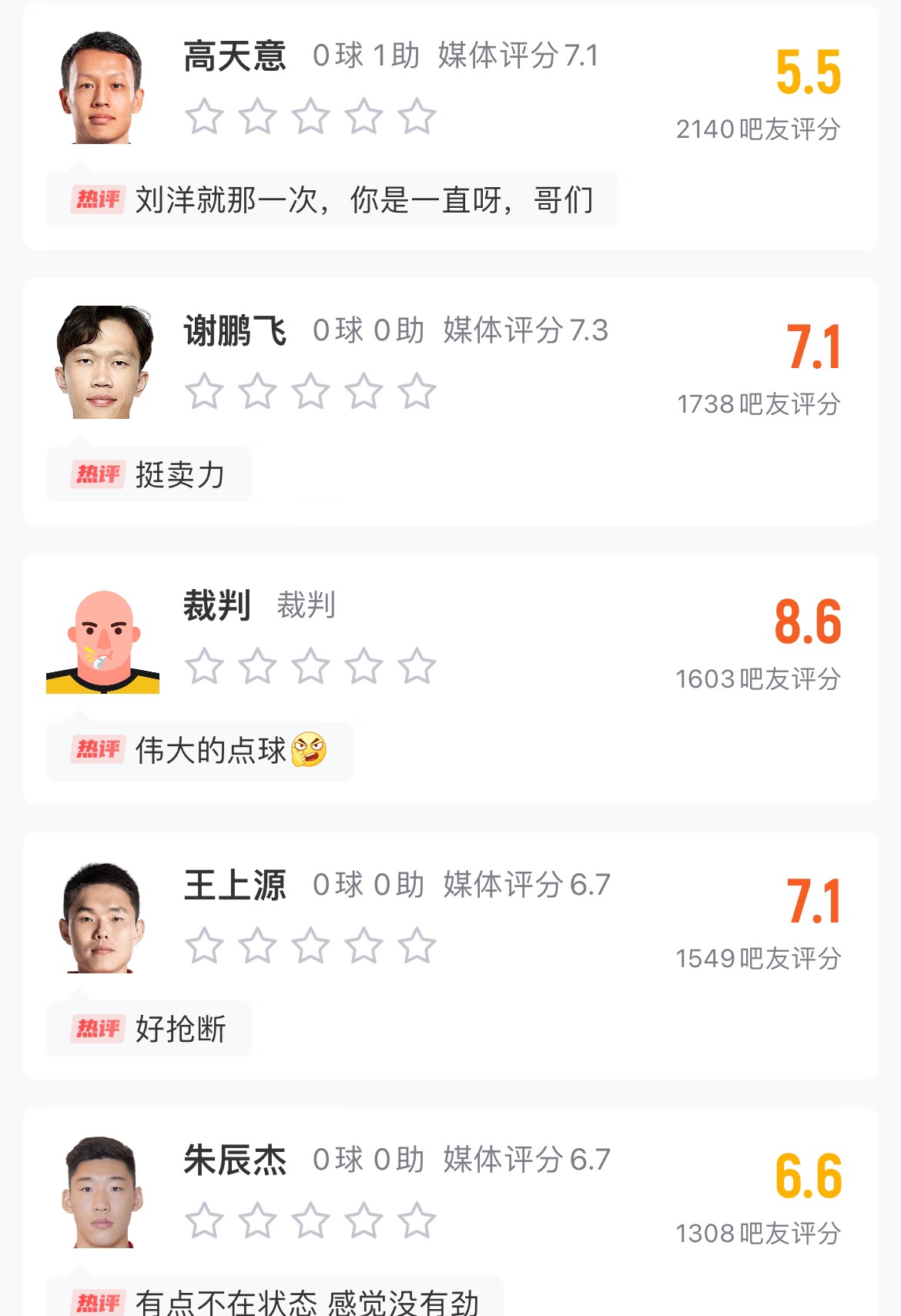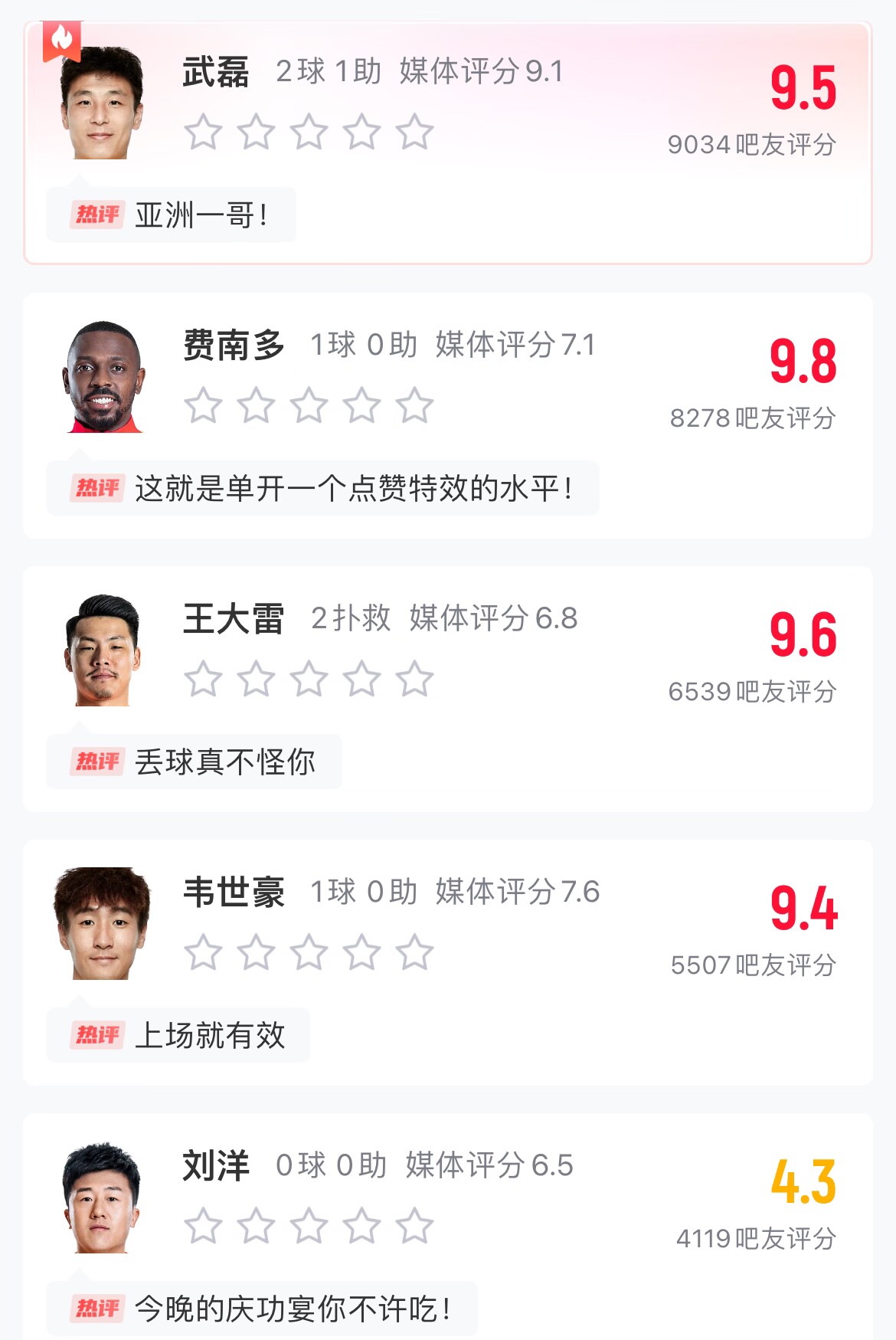 武磊獲得了9.5的高分,不愧是“亞洲一哥”。費南多9.8分全場最高,王大雷9.6分。丟球時漏人嚴重的劉洋只得到了4.3分,張玉寧5.7分,高天意5.5分。