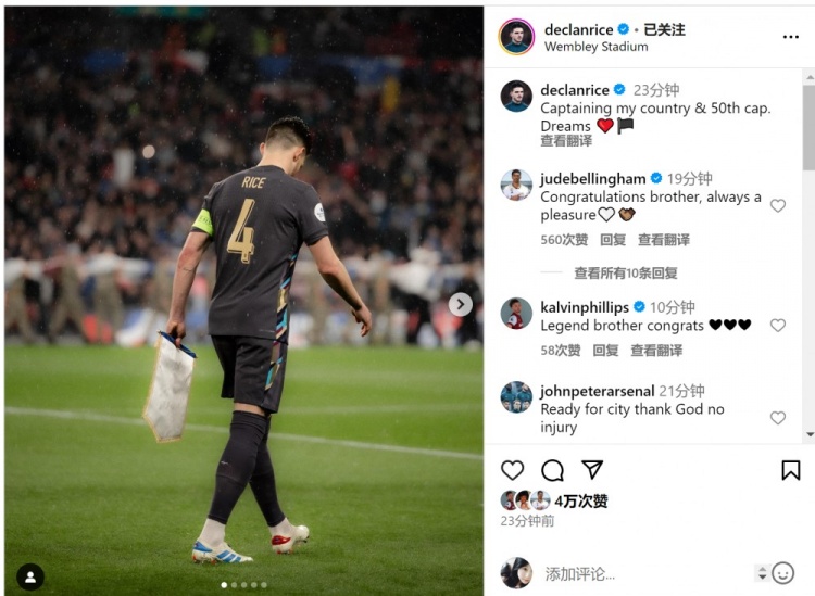 此役賴斯達成為英格蘭國家隊出戰50場比賽里程碑,賽后他在社交媒體上寫道:“擔任國家隊的隊長&50次出場,夢想成真。”