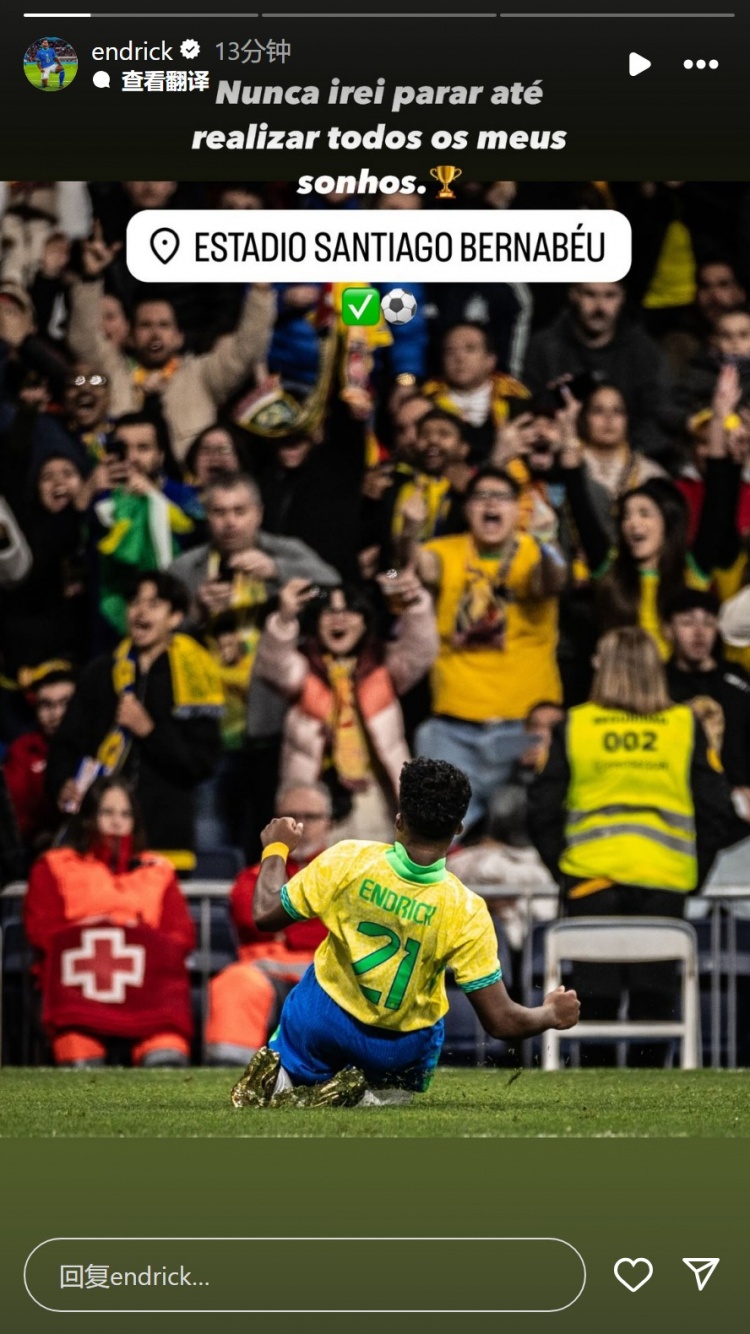 恩德里克連續兩場比賽為巴西破門,他在社交媒體上曬出自己慶祝進球的照片,并配文:“我永遠不會止步,直到我實現所有的夢想?!?/p>